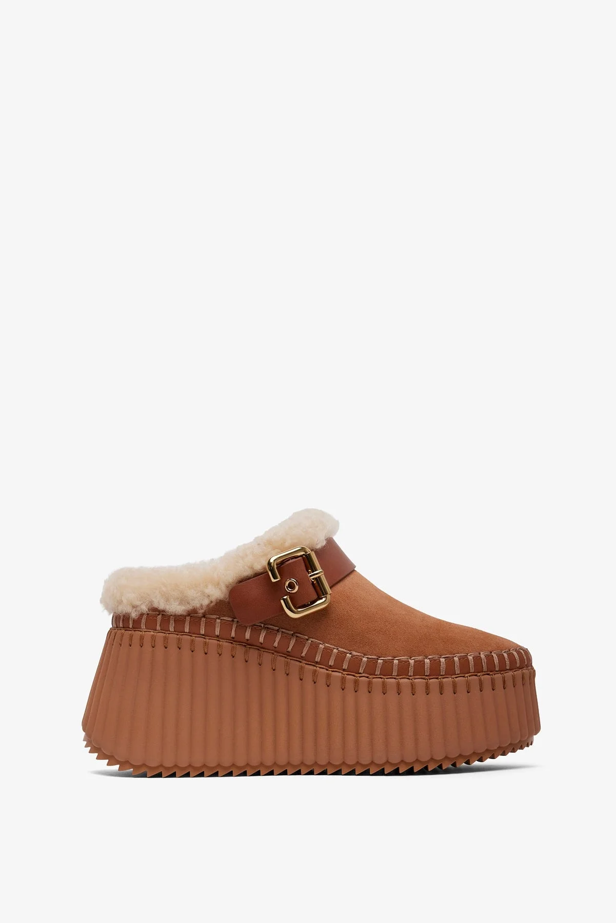 Brown shearling suede wedge mules from Chloe. The Nama shearling wedge mules are made of suede calfskin and shearling, featuring a leather strap embellished with the Maison’s signature Paddington buckle, set on an iconic, lightweight recycled platform. - Rubber sole - Wedge mule heel height: 80mm - Heel-to-toe drop: 45mm - True to size - Made in Italy Product Code: CH25W13CTX207