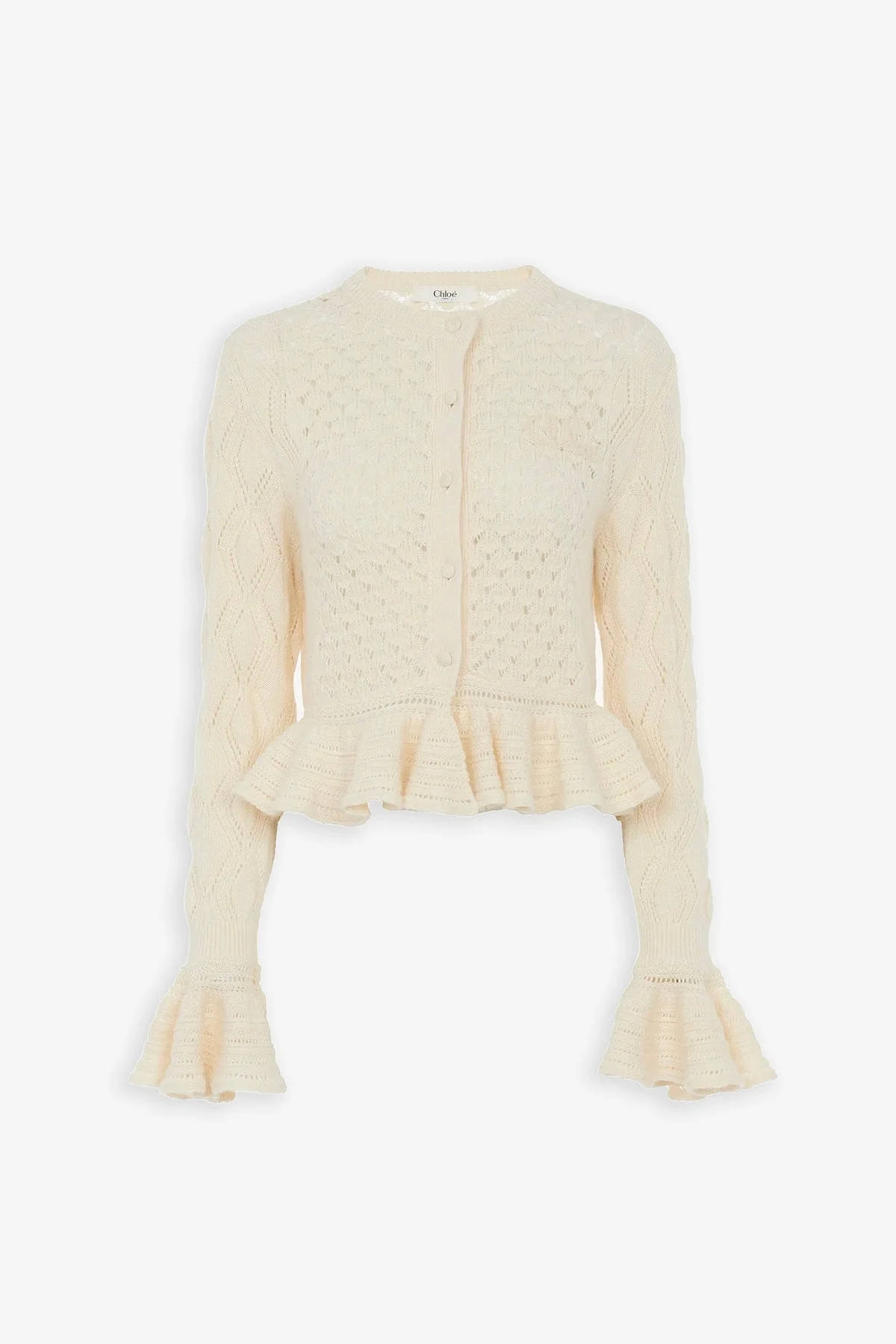 White alpaca wool pointelle knit from Chloe. The Ruffled knit cardigan is made in silk, alpaca wool and cotton featuring a flouncy hem and cuffs, with tonal Chloe logo embroidery and fabric-covered buttons at the front. - Material: 70% Cotton, 18% Alpaca Wool, 11% Silk, 1% Polyamide - Made in Italy Product Code: CH25AMC01590107