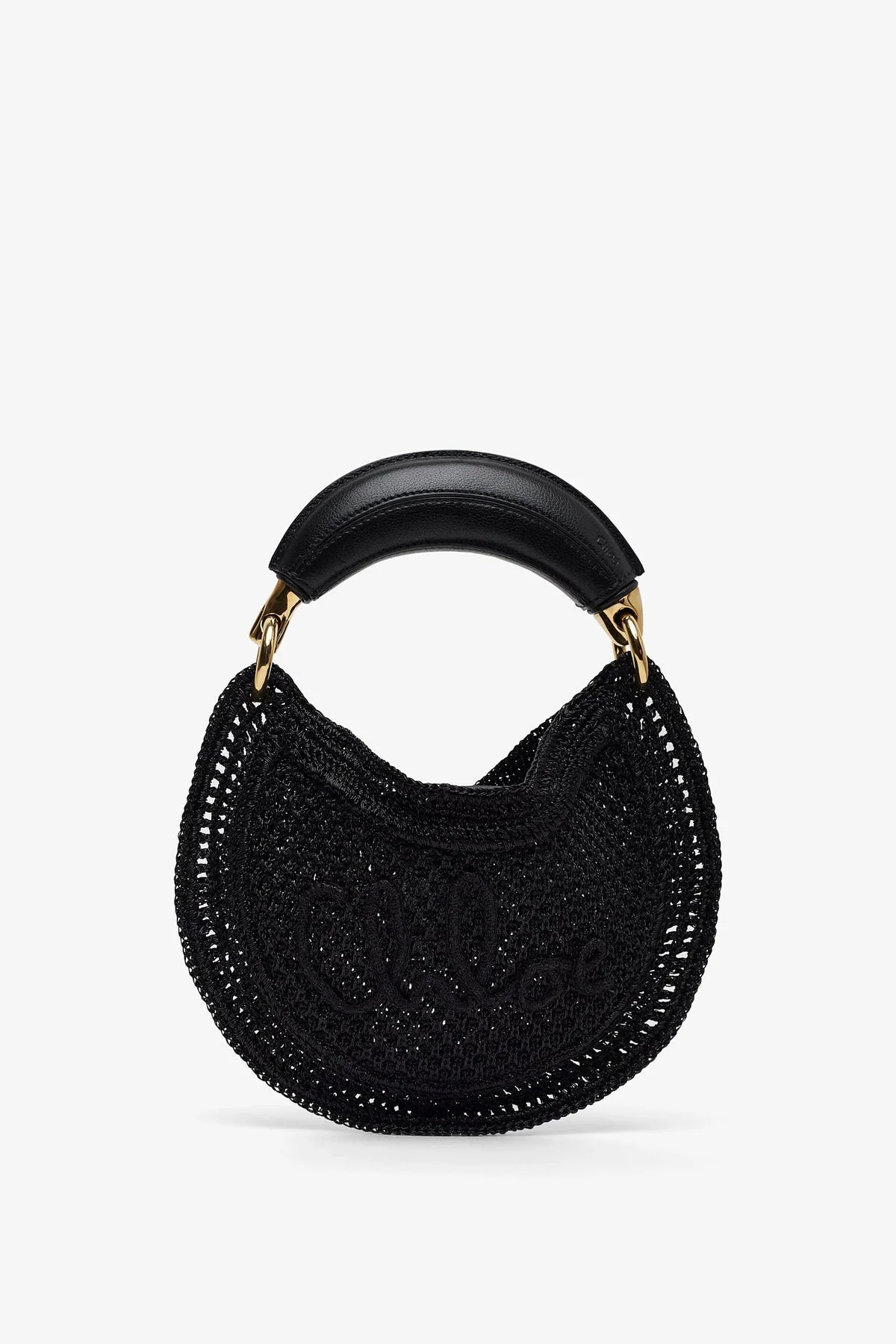 Black crochet and leather mini bag from Chloe. The mini Summer Banana bag is made in glitter crochet and buffalo leather. It has a curved silhouette featuring a banana-shaped handle and handwritten signature inspired by the Chloe heritage. - Measurements: L26 x H15.5 x W2 cm - Handle drop: 8 cm - Made in Italy Product Code: CH26SP921R34001