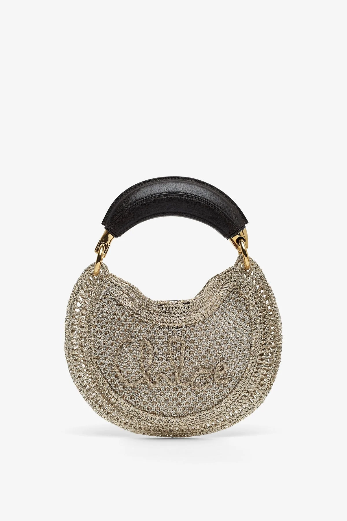 Silver crochet and leather mini bag from Chloe. The mini Summer Banana bag is made in glitter crochet and buffalo leather. It has a curved silhouette featuring a banana-shaped handle and handwritten signature inspired by the Chloe heritage. - Measurements: L26 x H15.5 x W2 cm - Handle drop: 8 cm - Made in Italy Product Code: CH26SP921R349DL
