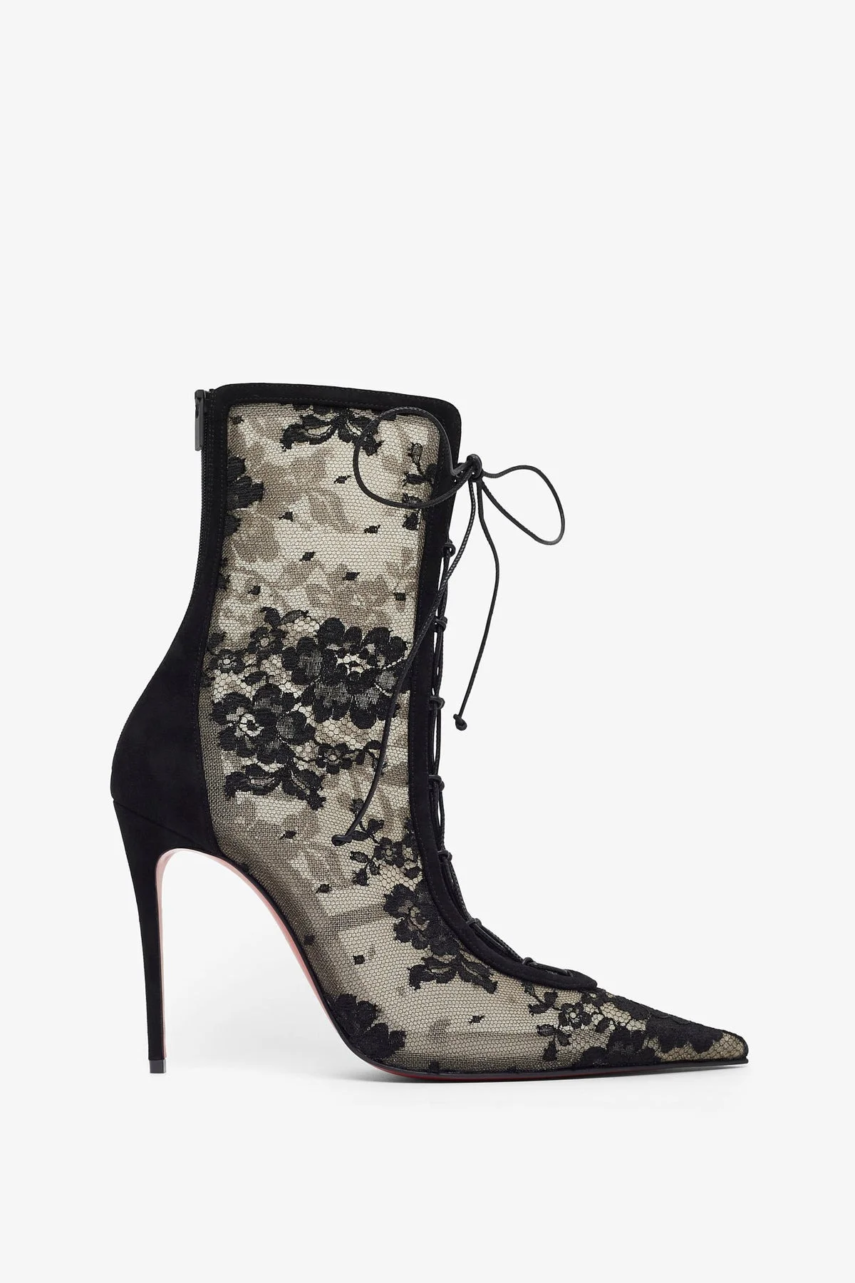 Black lace booty from Christian Louboutin. The KM Lace Booty are made of floral lace, veau velours and kid leather. It features a very pointed toe, with a padded insole and 100mm stiletto heel, set on the new "Everlasting Red" sole. - True to size - Signature 'everlasting' red leather sole - Made in Italy Christian Louboutin product care Product Code: 3250821-B439