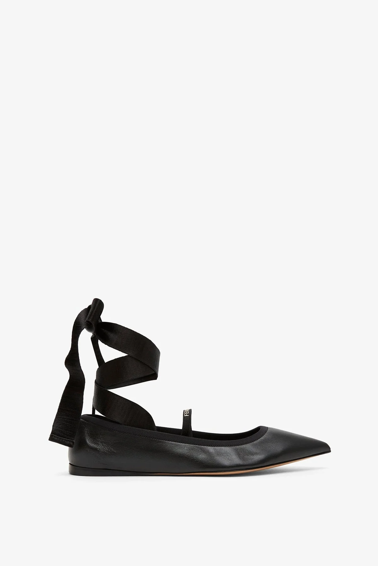 Black pointed ballet flats from Ferragamo. The ribbon ballet flats are made of soft calfskin leather with an elasticated Mary Jane strap, and removable silky ribbon that laces up around the calf.Leather sole - True to size - Made in Italy Product Code: 782673