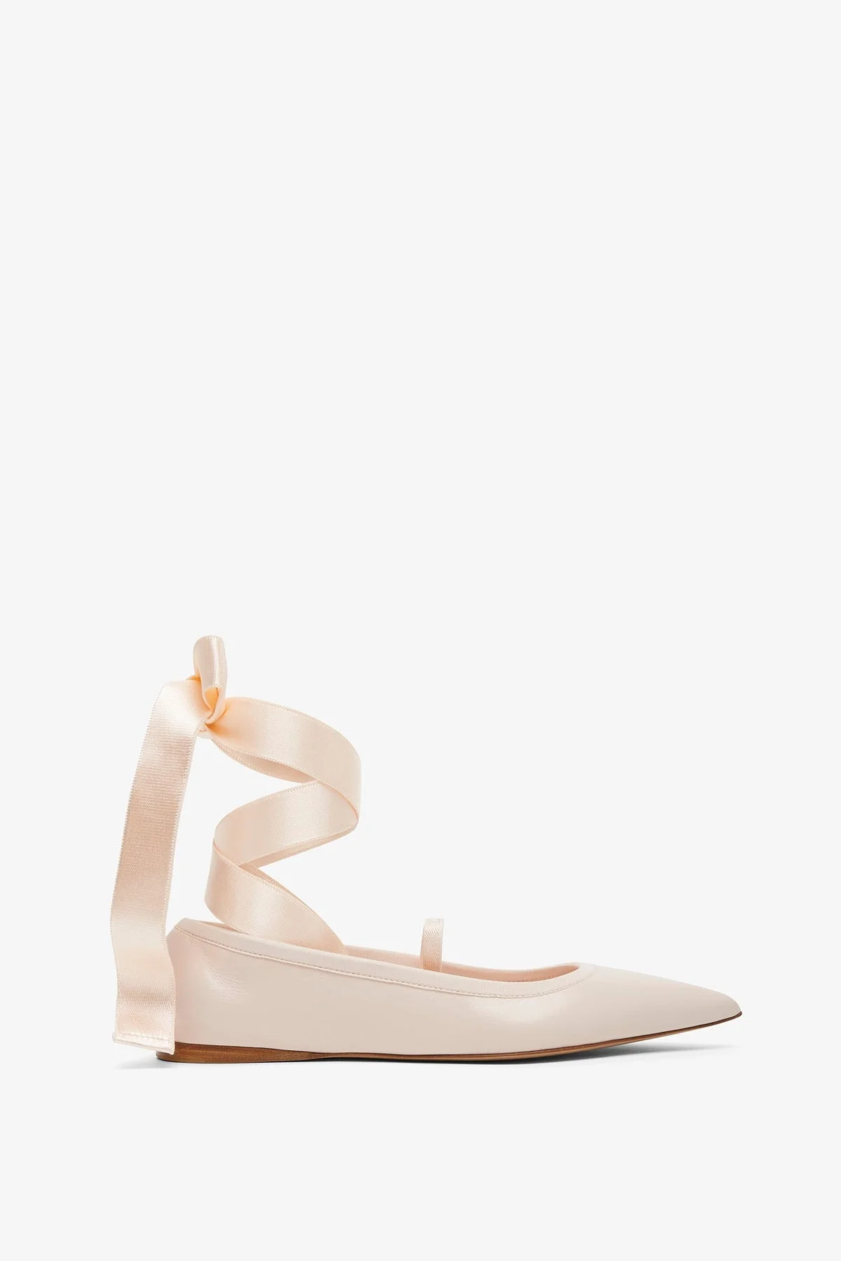 Light pink pointed ballet flats from Ferragamo. The ribbon ballet flats are made of soft calfskin leather with an elasticated Mary Jane strap, and removable silky ribbon that laces up around the calf. - Leather sole - True to size - Made in Italy Product Code: 782675