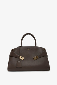 Brown leather tophandle tote bag from Ferragamo. The Hug M tophandle bag is made in leather, featuring an asymmetrical back panel that wraps around to "hug" the front via two wide straps with gold-toned Gancini clasps. It fastens on the inside with a metallic ring, the lined interior features a zip pocket, and a tonal leather fob is placed on the rigid top handle. It is complete with gold-toned studs at the base. - Measurements: L31.5 x H22 x W19 cm - Handle drop: 14cm - Strap length: 55cm - Made in Italy Product Code: 777258