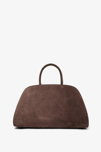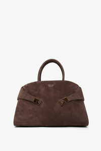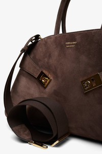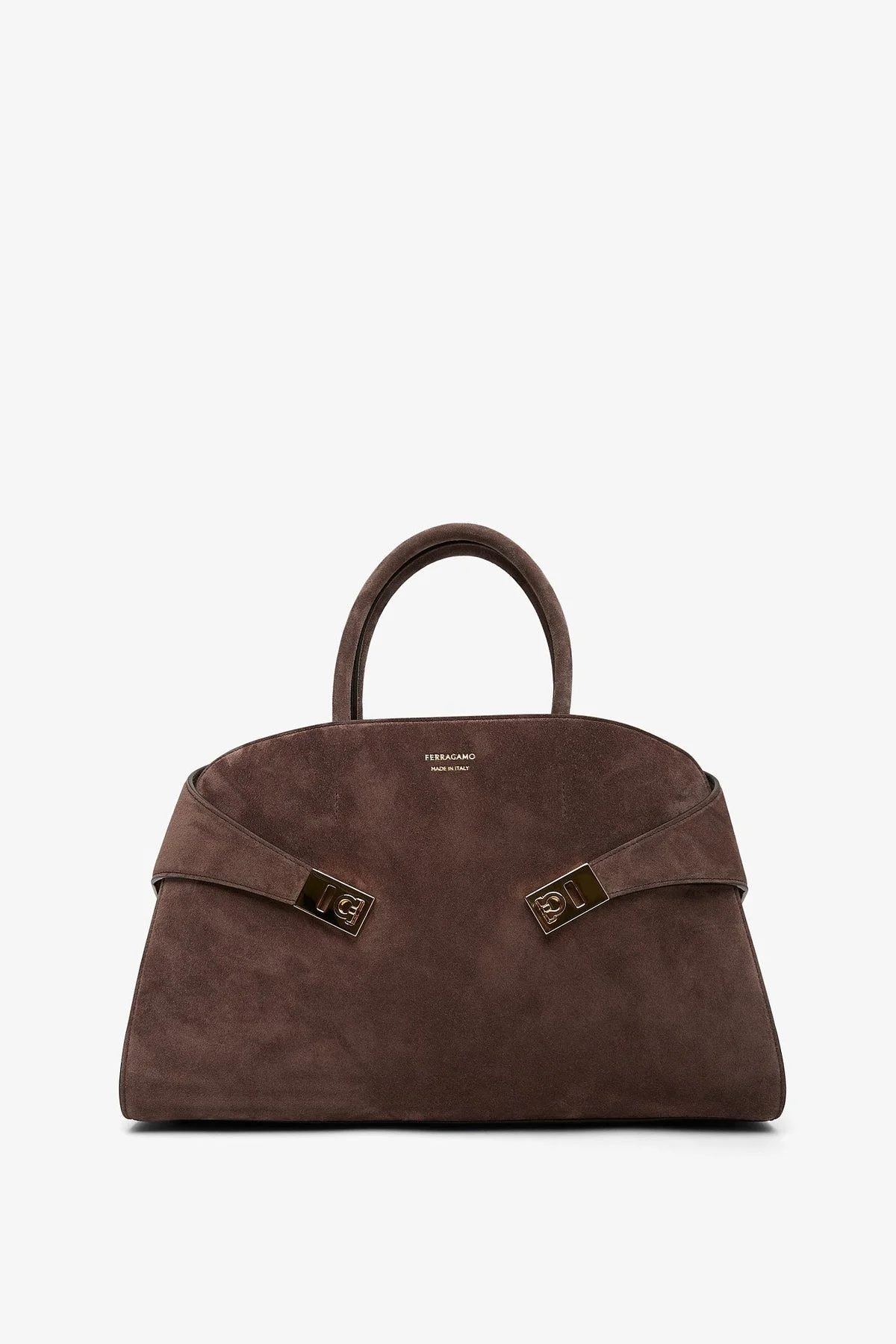 Brown suede leather top-handle bag from Ferragamo. The Hug top-handle bag is made of supple suede leather with gold-toned "Gancini" buckles along with studs at the base. - Measurements: L38 x H24 x W22 cm - Made in Italy Product Code: 779241