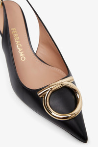 Black leather slingback from Ferragamo. The Sara slingback is made of kidskin leather, with a pointed profile and rounded vamp, decorated with an oversized gold-toned Gancini motif. It is set on a thin leather-covered heel measuring 40mm. - Leather sole - True to size - Made in Italy Product Code: 784806