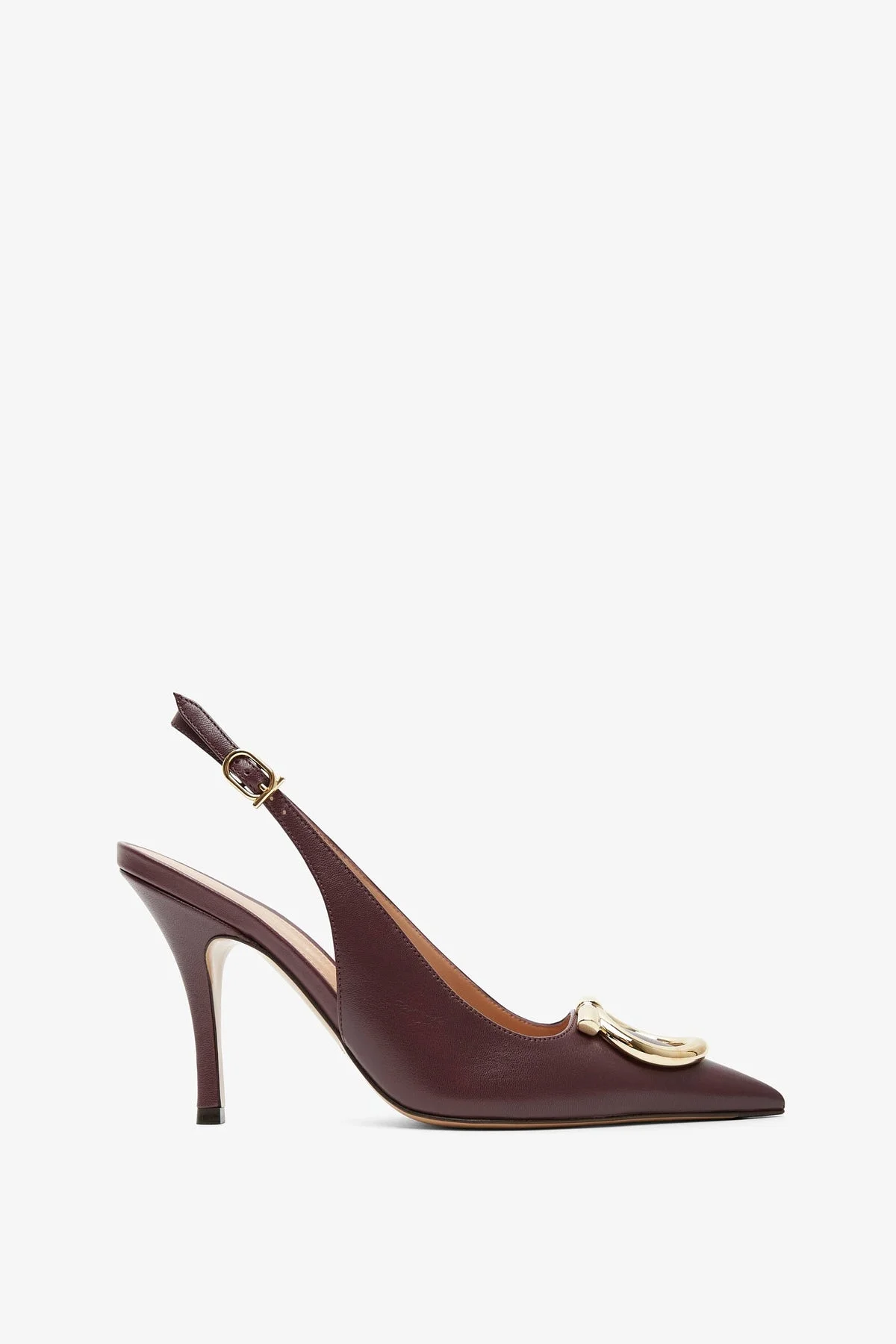 Dark red leather slingback pumps from Ferragamo. The Sara slingback pumps are made of kidskin leather, with a pointed profile and rounded vamp, decorated with an oversized gold-toned Gancini motif, set on a thin leather-covered heel measuring 95mm. - Leather sole - True to size - Made in Italy Product Code: 784825