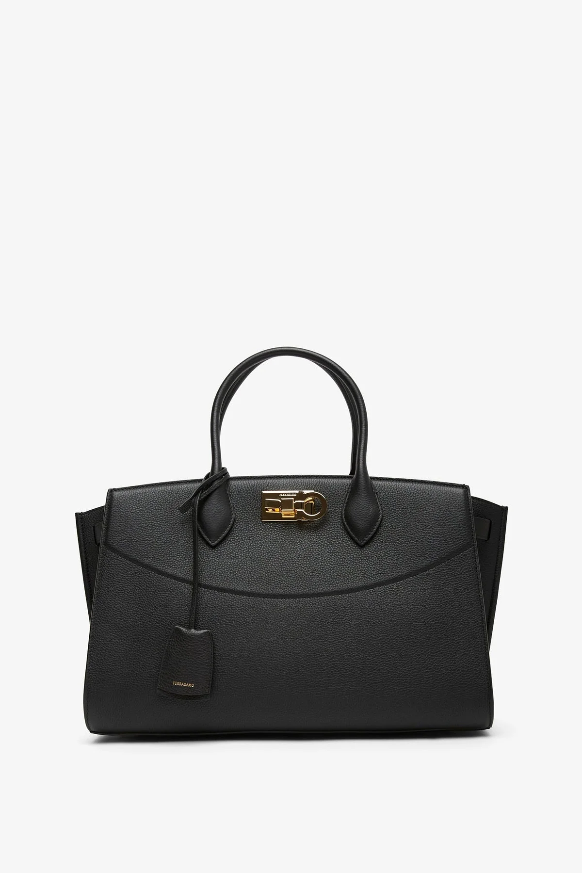 Black leather tote bag from Ferragamo. The new studio bag is made of calfskin leather with tonal top handle. It fastens via a golden Gancio slider clasp, with tonal covered key ring, complete with an adjustable removable shoulder strap. - Measurements: L36 x H24 x W16.5 cm - Made in Italy Product Code: 785995