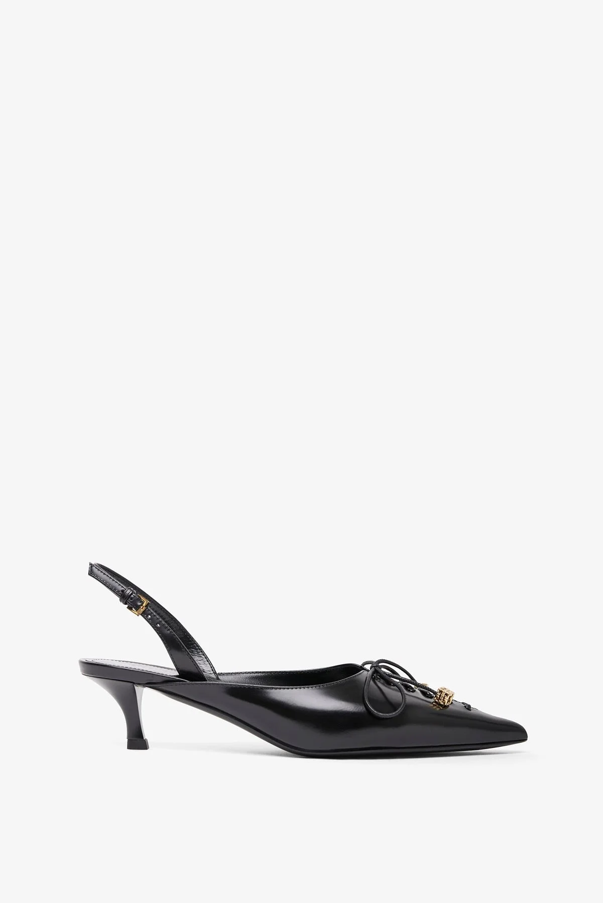 Black brushed calfskin leather slingbacks from Givenchy. The Black leather slingbacks are made of brushed calfskin leather, featuring laces with tone-on-tone metal eyelets and small 4G Liquid metal cubes at the ends. They have a thin back strap with metal buckle, golden finish metal details, pointed toes and a thin heel measuring 4.5cm. - Leather sole - True to size - Made in Italy Product Code: BE4040E1YC001
