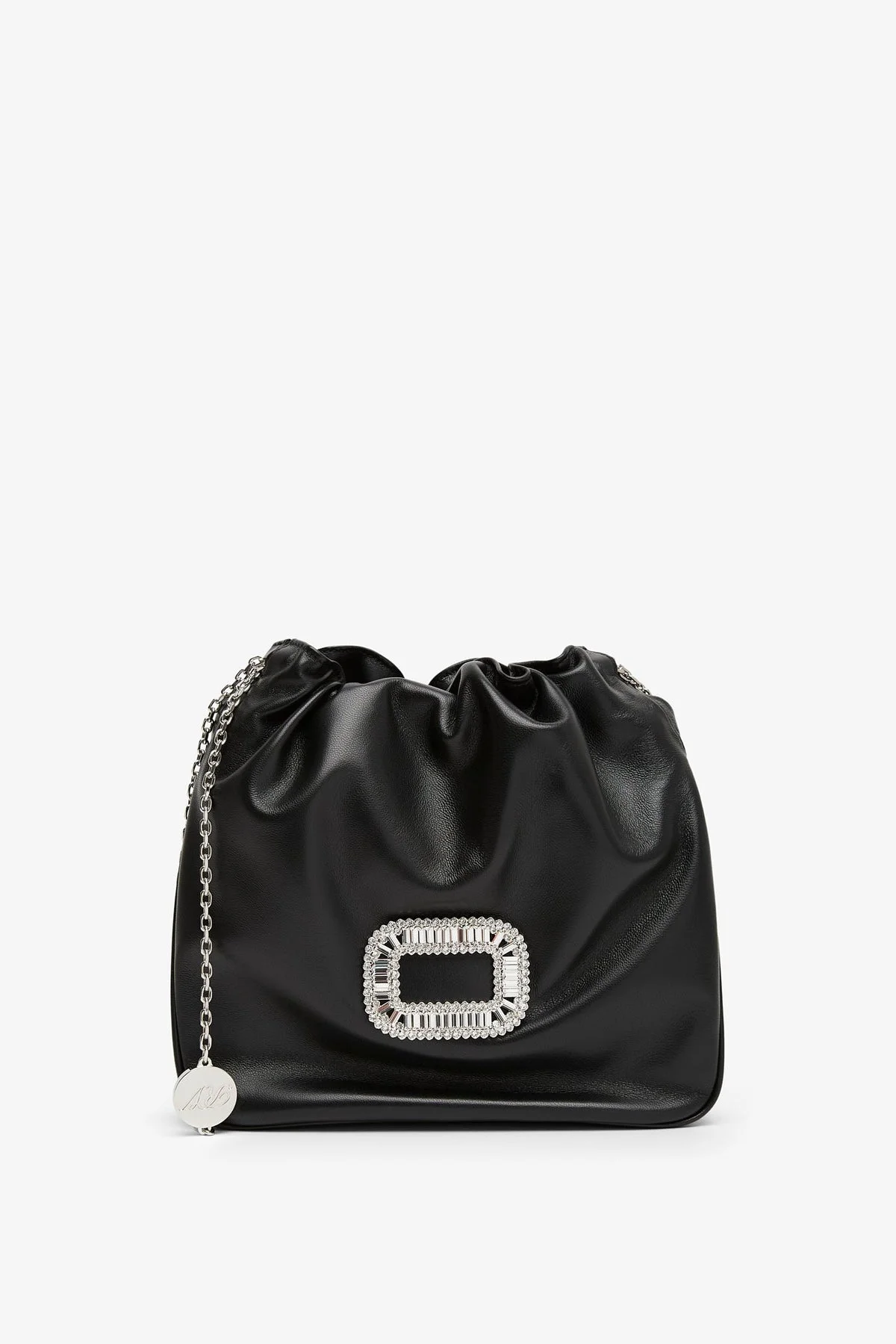 Black leather bucket bag from Roger Vivier. The Pilgrim pocket bucket bag is made of ovine nappa leather with satin lining, and double metal chain with RV charm. It is complete with a crystal buckle at the front. - Measurements: L23 x H21 x W5cm - Made in Italy Product Code: RBWABDK0100YDRB999
