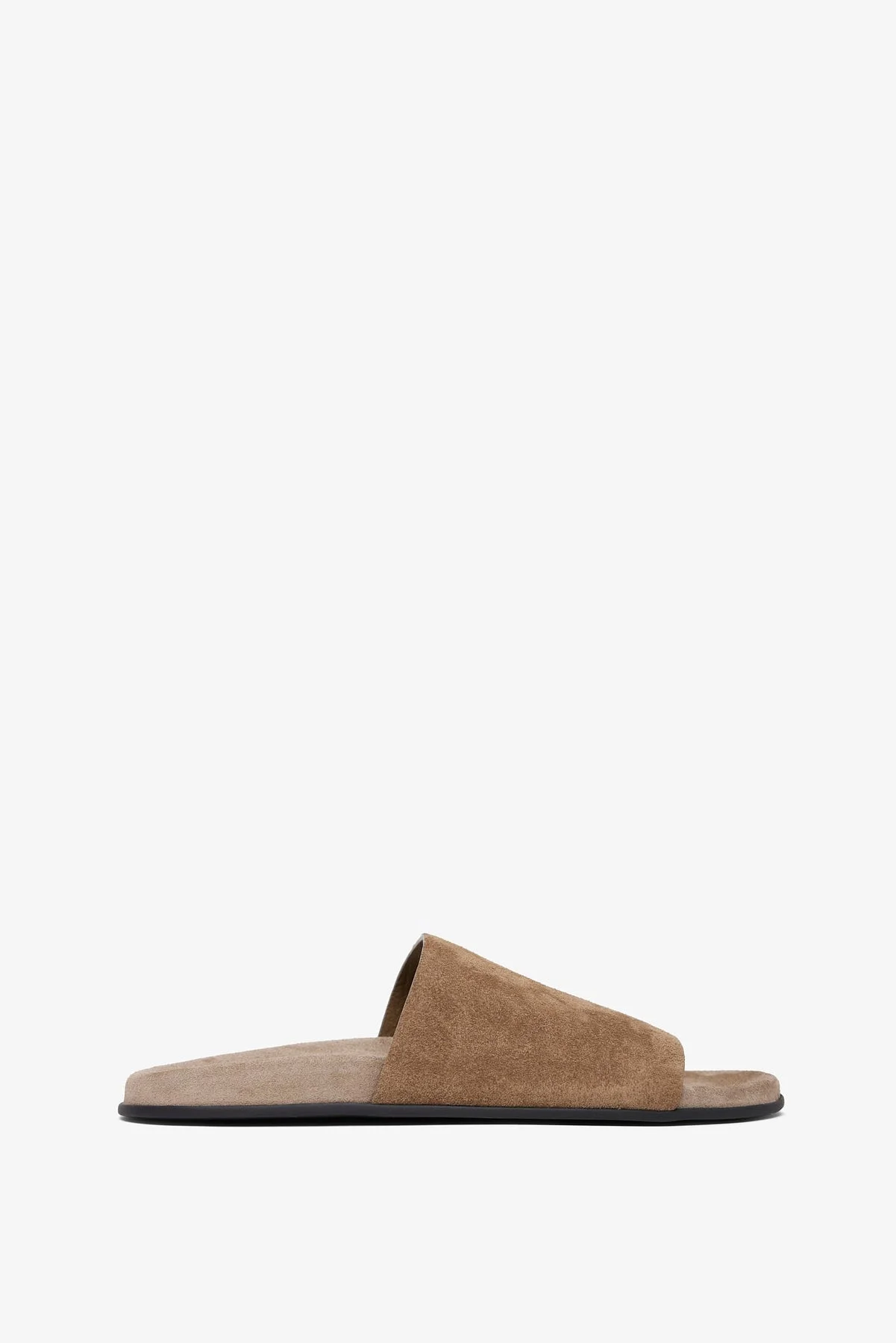 Green suede slip-on slides from The Row. The Hugh slides are made in soft suede with contoured footbed and rubber sole. - Rubber sole - True to size - Made in Italy Product Code: F1660-L302-MTR