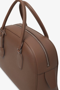 Dark olive leather top-handle bag from The Row. The India top-handle bag is made in textured calfskin leather with tubular handles, branded metal padlock and key, and zipper closure. It is minimally finished, the natural grain surface is left intact, giving the leather a supple hand and refined texture that develops character over time. - Measurements: L32 x H25 x W12 cm - Made in Italy Product Code: W1595-L129-DOK