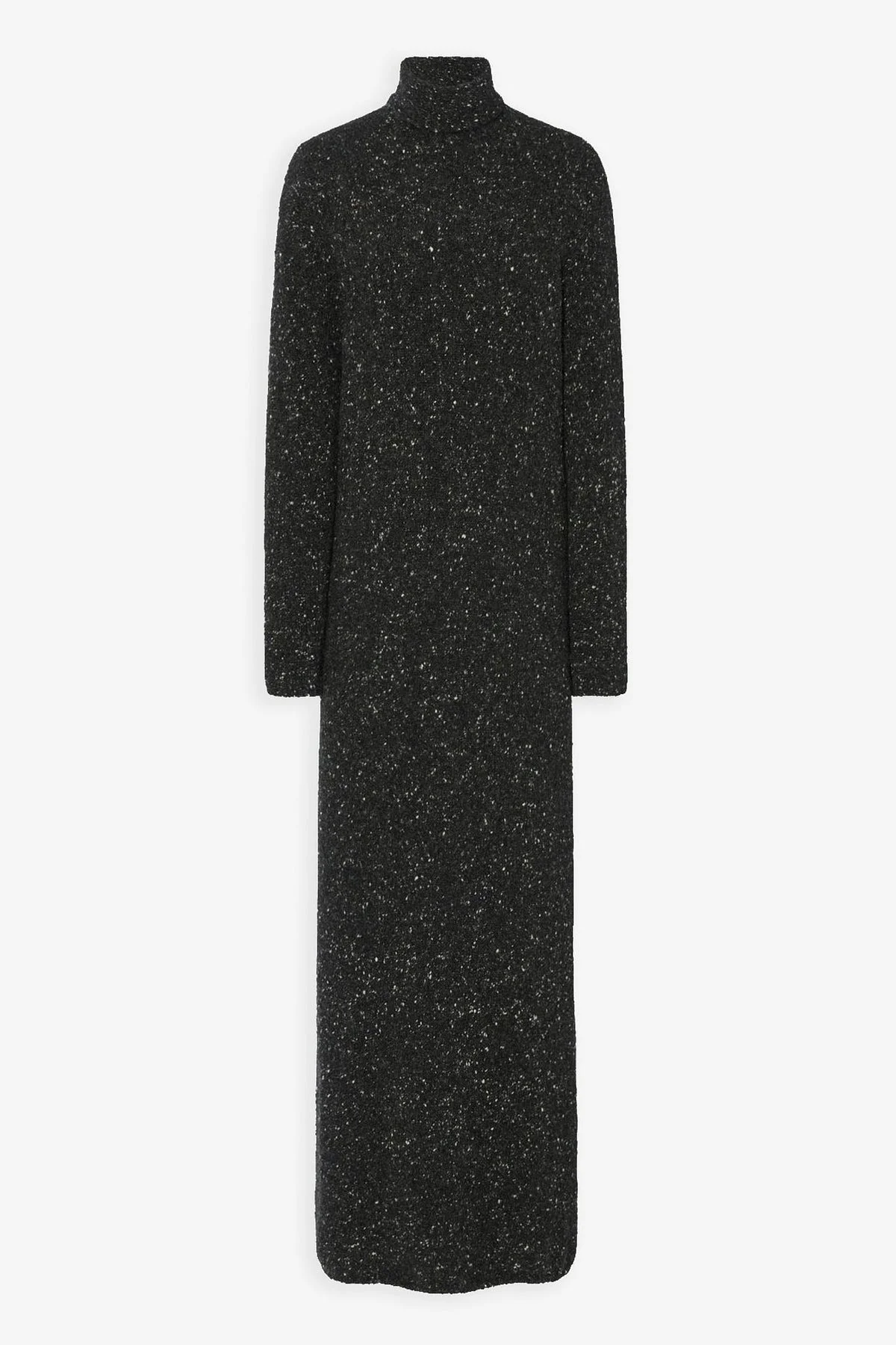 Black cashmere dress from The Row. The Melani ankle-length column dress is made in speckled midweight cashmere with rolled turtleneck and seamless construction. - Material: 100% Cashmere - Made in Italy Product Code: 10423-Y632-CCM