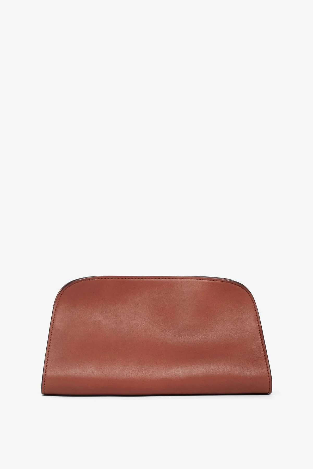 Brown leather clutch bag from The Row. The Peggy clutch is made in polished saddle leather with single shoulder strap and gusseted side panels. - Measurements: L28 x H15 x W11 cm - Length of handle: 52 cm - Made in Italy Product Code: W1774-L72-NBAS