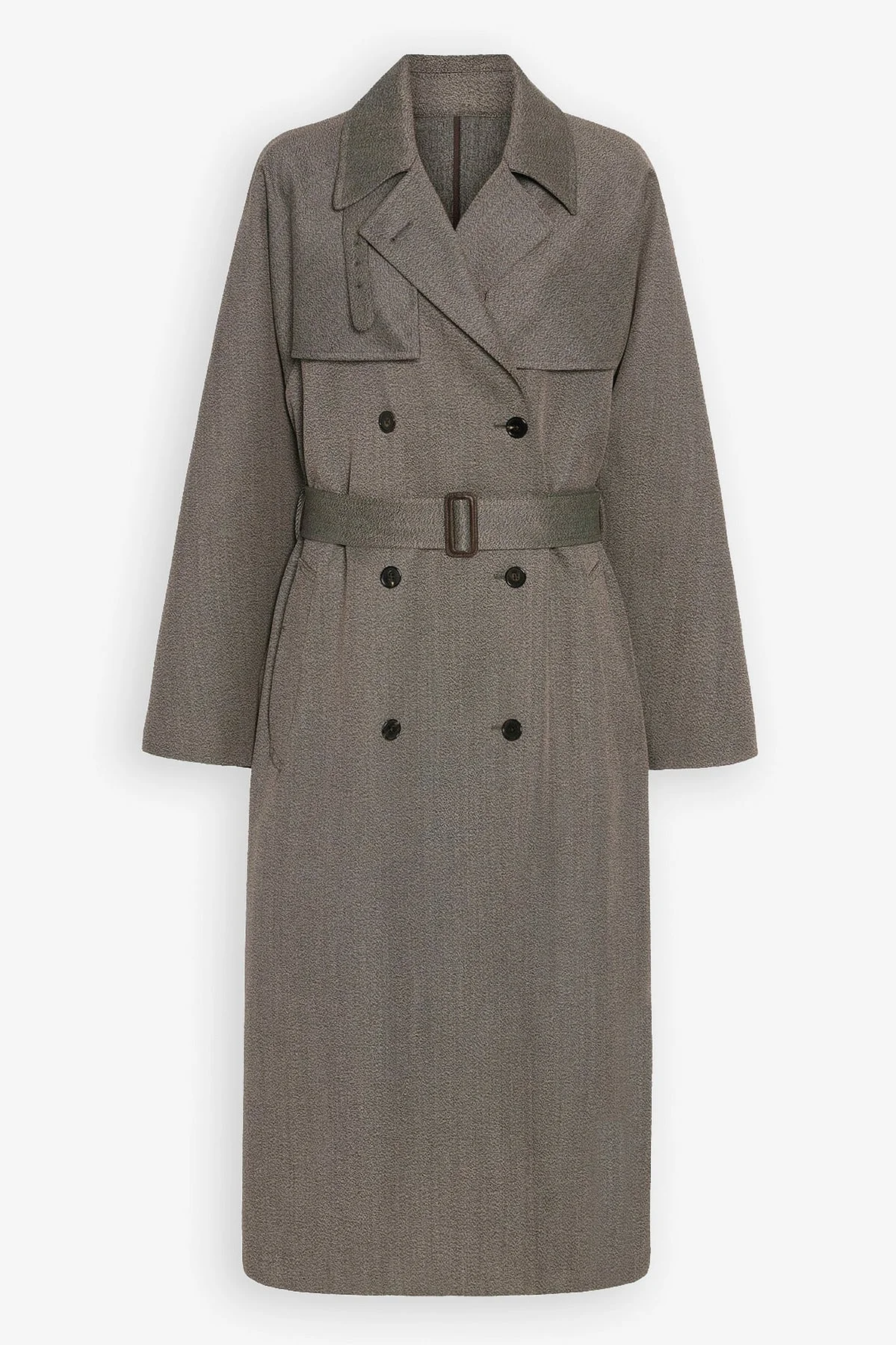 Black and light brown gabardine coat from The Row. The Rhydian oversized double-breasted trench coat is made in sleek virgin wool gabardine with slant welt pockets, horn button closure, and removable belt with buckle. - Material: 100% Wool - Lined in 55% Silk, 45% Cashmere - Made in Italy Product Code: 10228-W4094-BCN