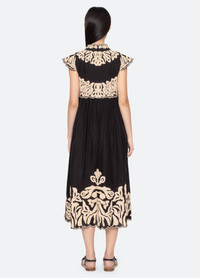 The Alexandra embroidered dress features delicate cap sleeves and a flowing midi silhouette. Intricate abstract embroidery embellishes the dress, adding a contemporary, artful touch to the design. DETAILS - lining-100% cotton - embroidery-50% viscose, 50% polyester - invisible back zipper - designed for a relaxed fit - style #RS26-055 - model is 5'10'' and wearing a size S