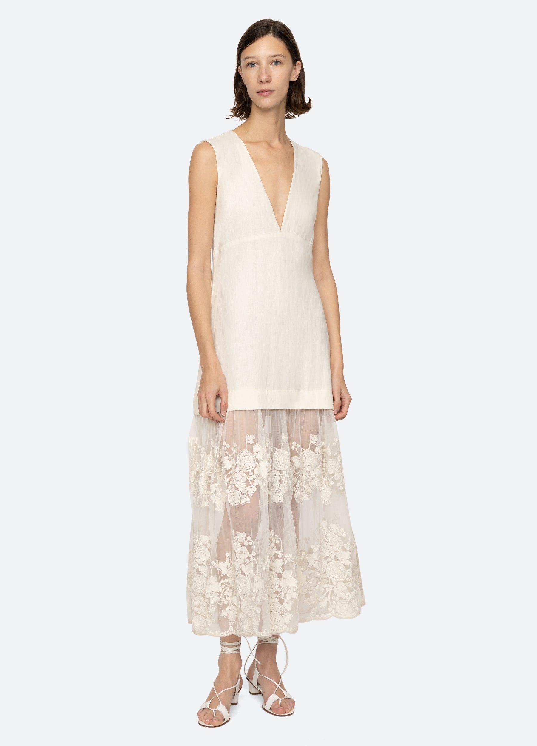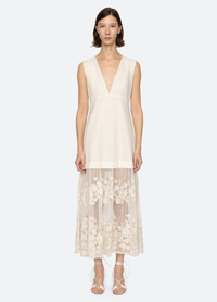 The Arielle lace v-neck dress features a deep v-neck line, sheer applique mesh skirt and midi silhouette. DETAILS - self-80% linen, 20% cotton - lining-100% cotton - combo-100% polyester - invisible back zipper - designed for a slimmer fit - style #PF25-034 - model is 5'10'' and wearing a size 4
