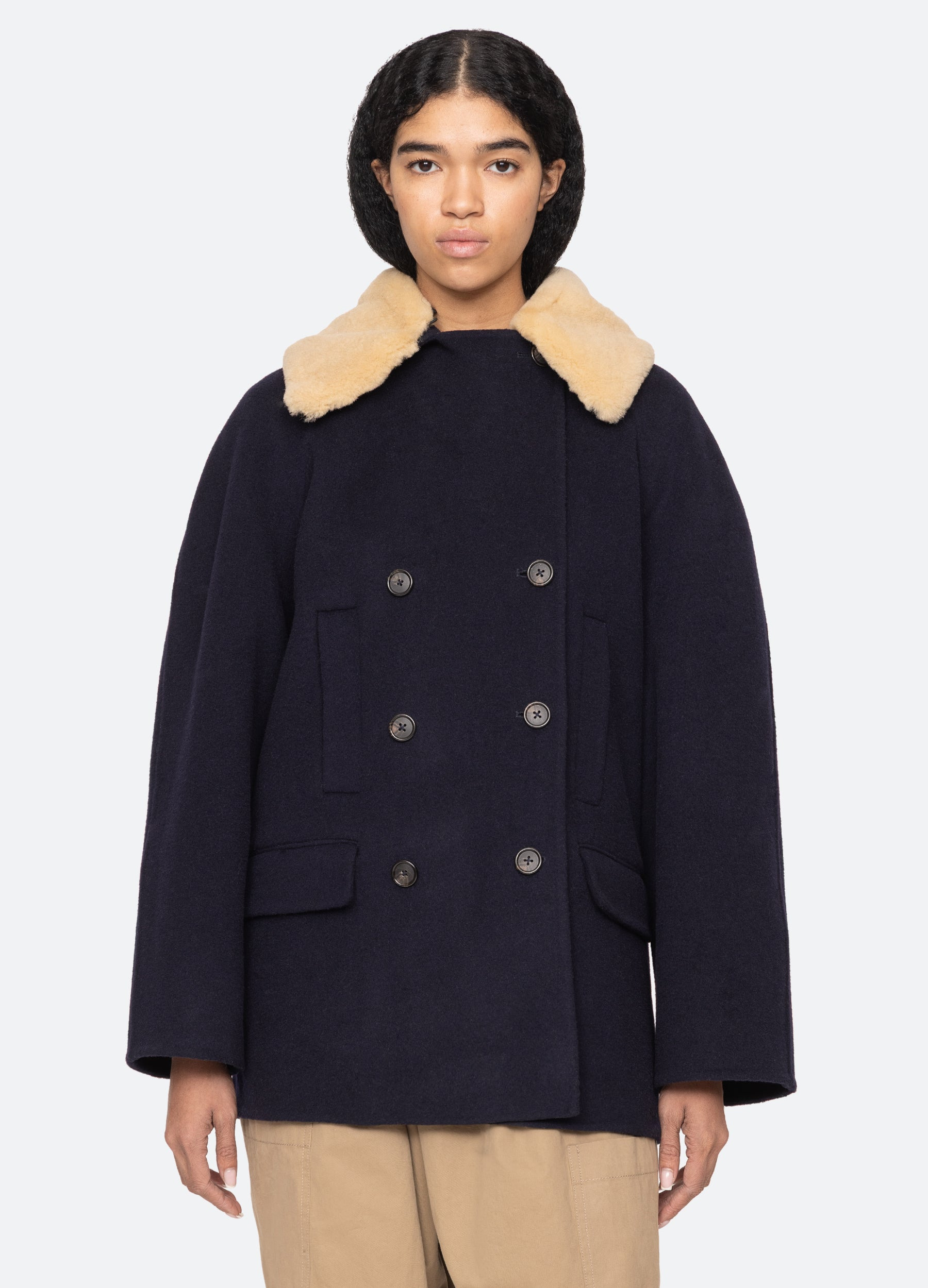 The Astra double faced wool peacoat exudes timeless sophistication with its double-breasted design, plush shearing collar, and streamlined straight-fit silhouette. DETAILS - self-100% wool - collar-50% nylon, 30% resin, 20% leather - lining-55% polyester, 45% viscose - button front - designed for an oversized, relaxed fit - style #AW25-073 - model is 5'10'' and wearing a size S