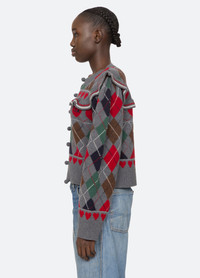 Part of the apres ski capsule, the Bernie knit argyle sweater is designed with voluminous puff sleeves, button-front closure, and delicate ruffle trim along the yoke. Its vintage-inspired detailing brings a romantic touch to a timeless silhouette. DETAILS - 100% wool - button front - designed for a relaxed fit - style #AS25-012 - model is 5'10'' and wearing a size S