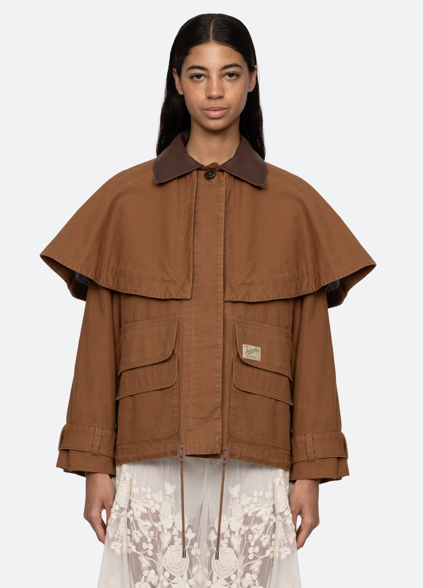 The Carolyn workwear cape jacket features oversized pockets, custom 'Sea' label and adjustable drawstrings at the hemline. Due to the garment dye process, color variation may occur. No two are exactly alike. Designed for an oversized, relaxed fit. DETAILS - self-100% cotton - lining-50% cotton, 50% polyester - button front - style #PF25-037 - model is 5'10'' and wearing a size S