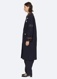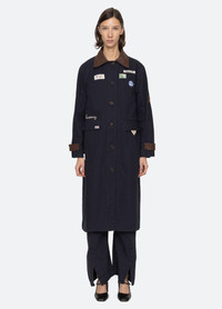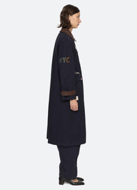 The Carolyn coat is a workwear-inspired piece featuring custom Sea labels and intricate embroidered detailing throughout. This versatile coat blends utilitarian elements with refined craftsmanship. Perfect for layering, it offers an effortlessly chic approach to outerwear. Due to the garment dye process, color variation may occur. No two are exactly alike. DETAILS - self-100% cotton - lining-50% cotton, 50% polyester - button front - designed for a relaxed fit - style #PF25-039 - model is 5'10'' and wearing a size S