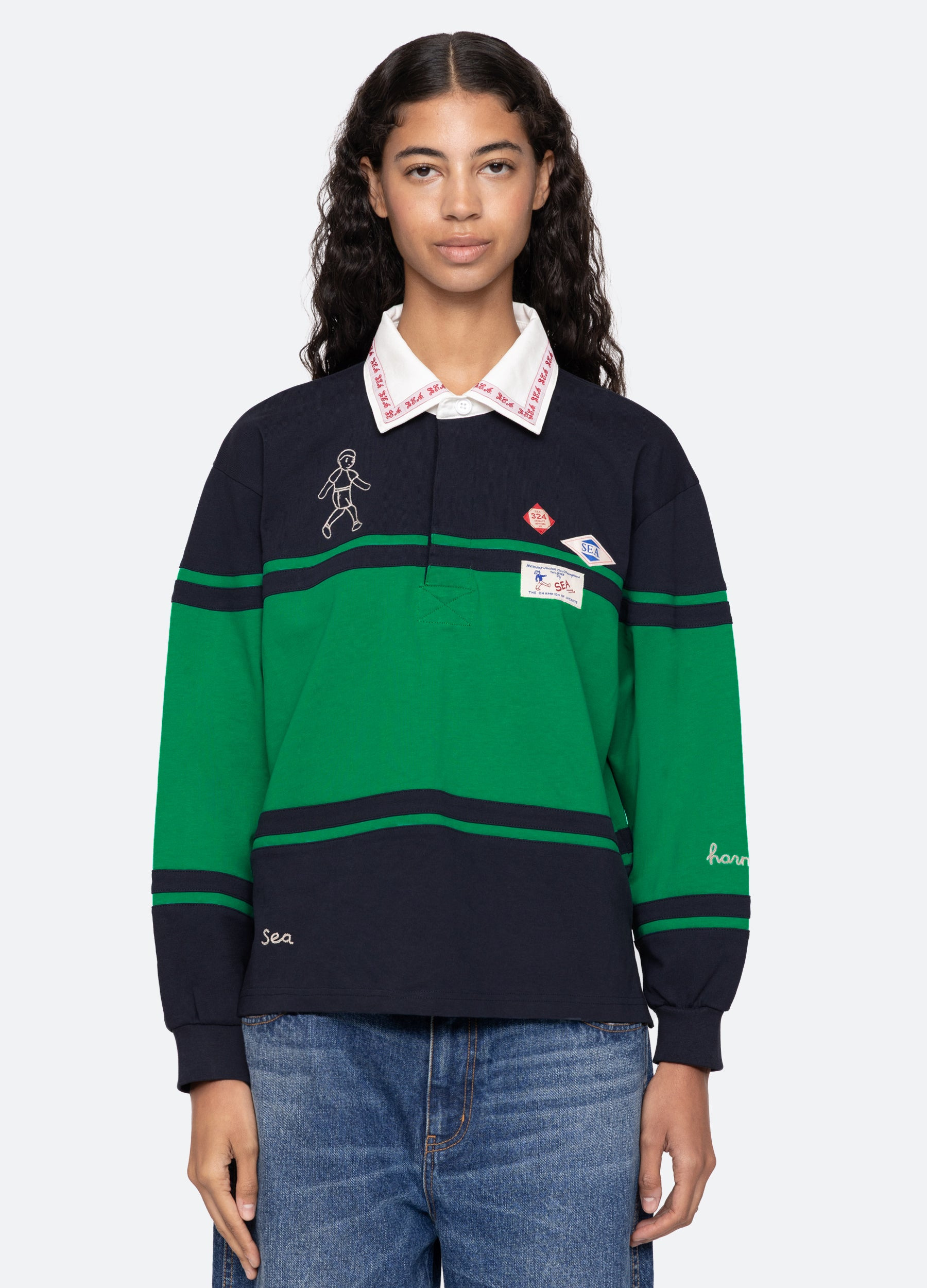The Carolyn long sleeve rugby shirt is a workwear-inspired rugby top featuring long puff sleeves, custom Sea labels, and intricate embroidered detailing. Designed with a button-front closure, this versatile piece blends utility with feminine charm, making it a unique addition to any wardrobe. DETAILS - self-100% cotton - combo-95% cotton, 5% spandex - button front - style #RS26-416 - model is 5'10'' and wearing a size S