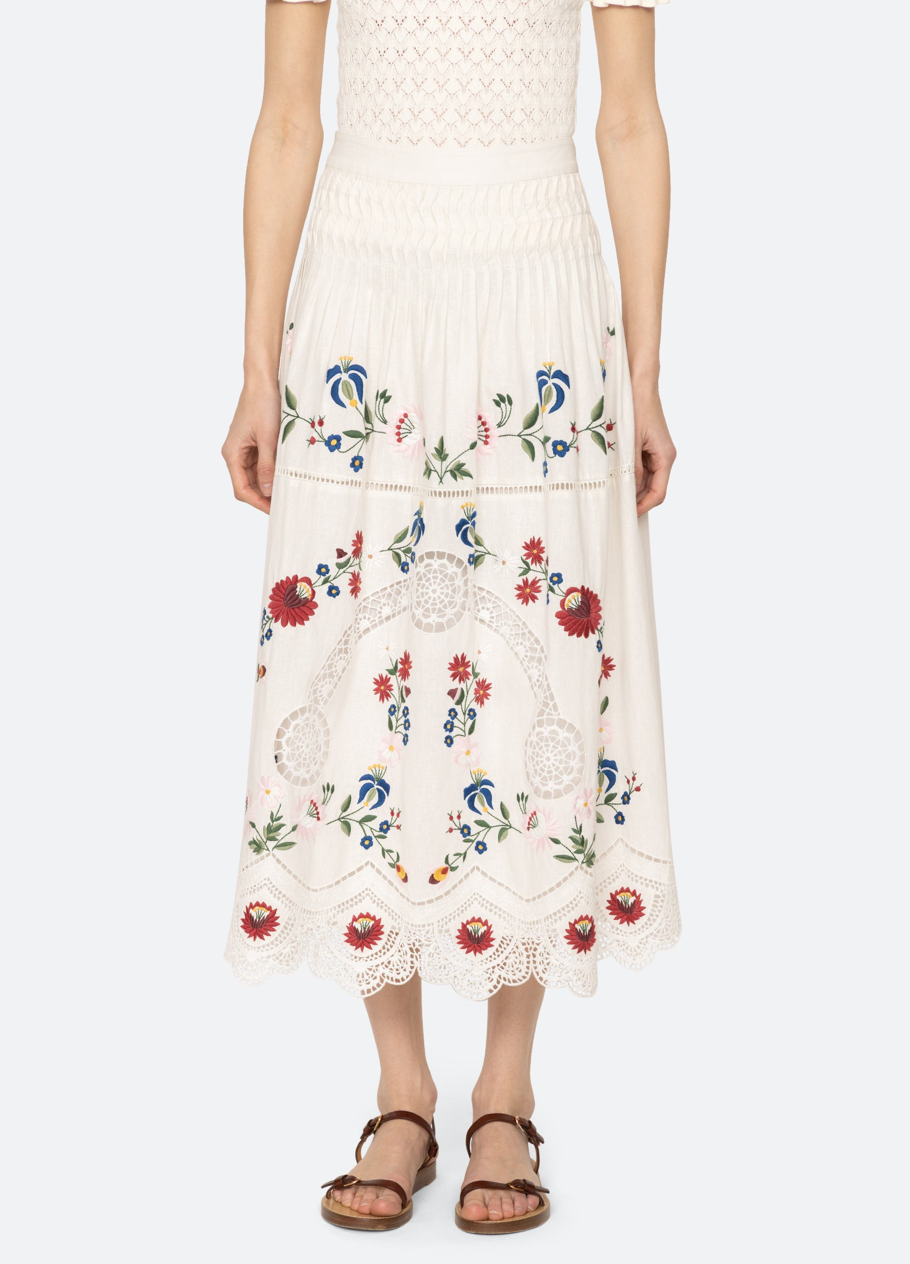 The Celia embroidered skirt features a harmonious blend of elegance and intricate craftsmanship. This midi-length skirt showcases detailed floral embroidery throughout, offering a timeless addition to your wardrobe. DETAILS - self-70% cotton, 30% linen - lining-100% cotton - invisible side zipper - designed for a slimmer fit - style #PF25-048 - model is 5'10'' and wearing a size 4