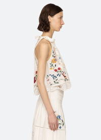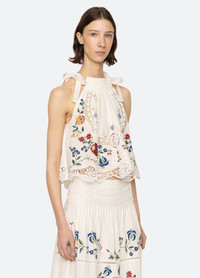 The Celia embroidered halter top features a sophisticated blend of elegance and intricate design. This halter-style top features detailed floral embroidery throughout, exuding a timeless charm. The adjustable ties at the neckline ensure a personalized fit, while the cropped silhouette adds a contemporary flair. Crafted with meticulous attention to detail, this top is as comfortable as it is stylish DETAILS - 70% cotton, 30% linen - ties at shoulder - designed for a relaxed fit - style #PF25-043 - model is 5'10'' and wearing a size S