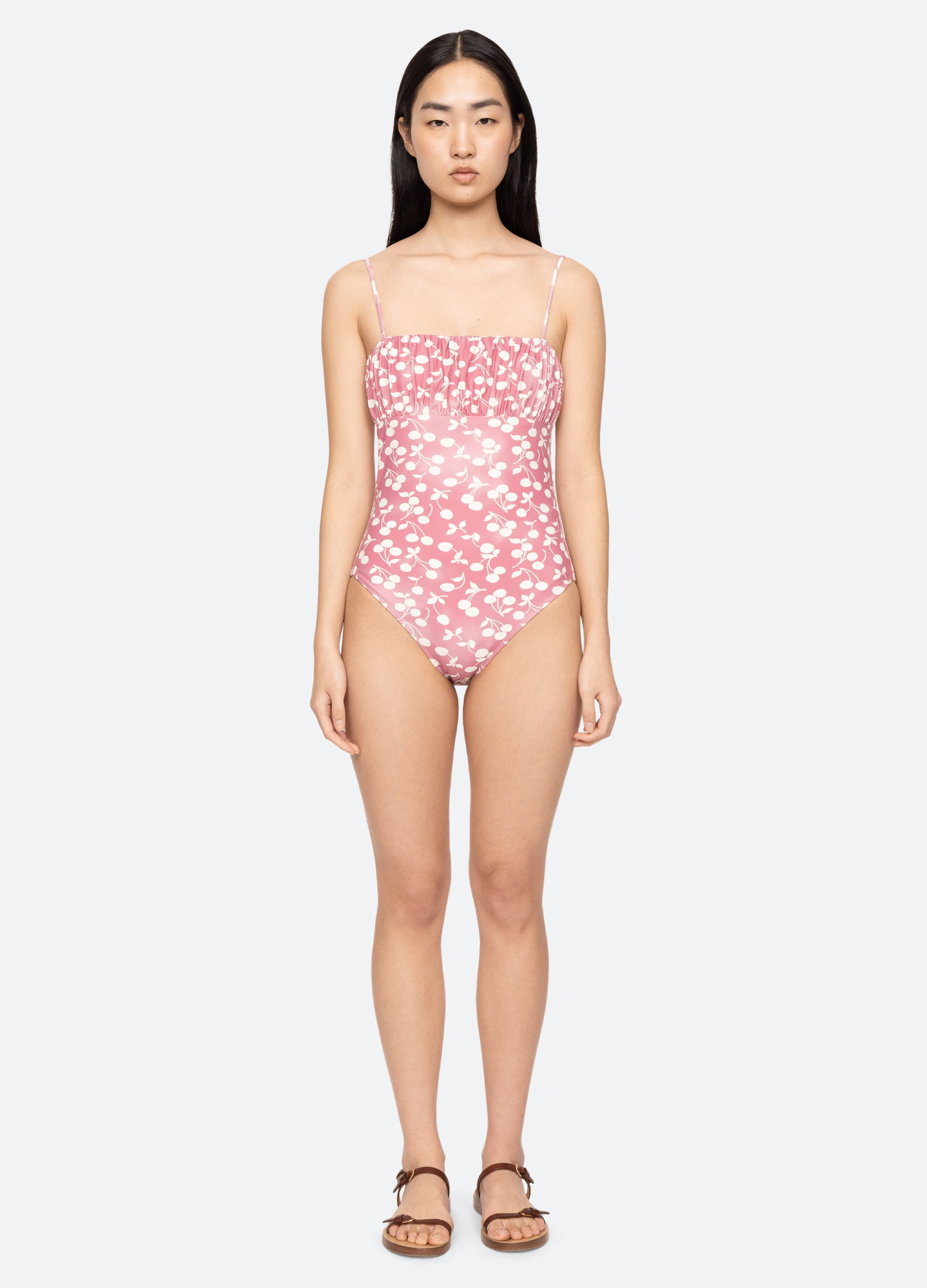 The Cheri fruit print one piece features ruched detailing and a playful cherry print. DETAILS - 60% nylon, 40% spandex - slip on - designed for a slimmer fit - style #PF25-703 - model is 5'10'' and wearing a size S