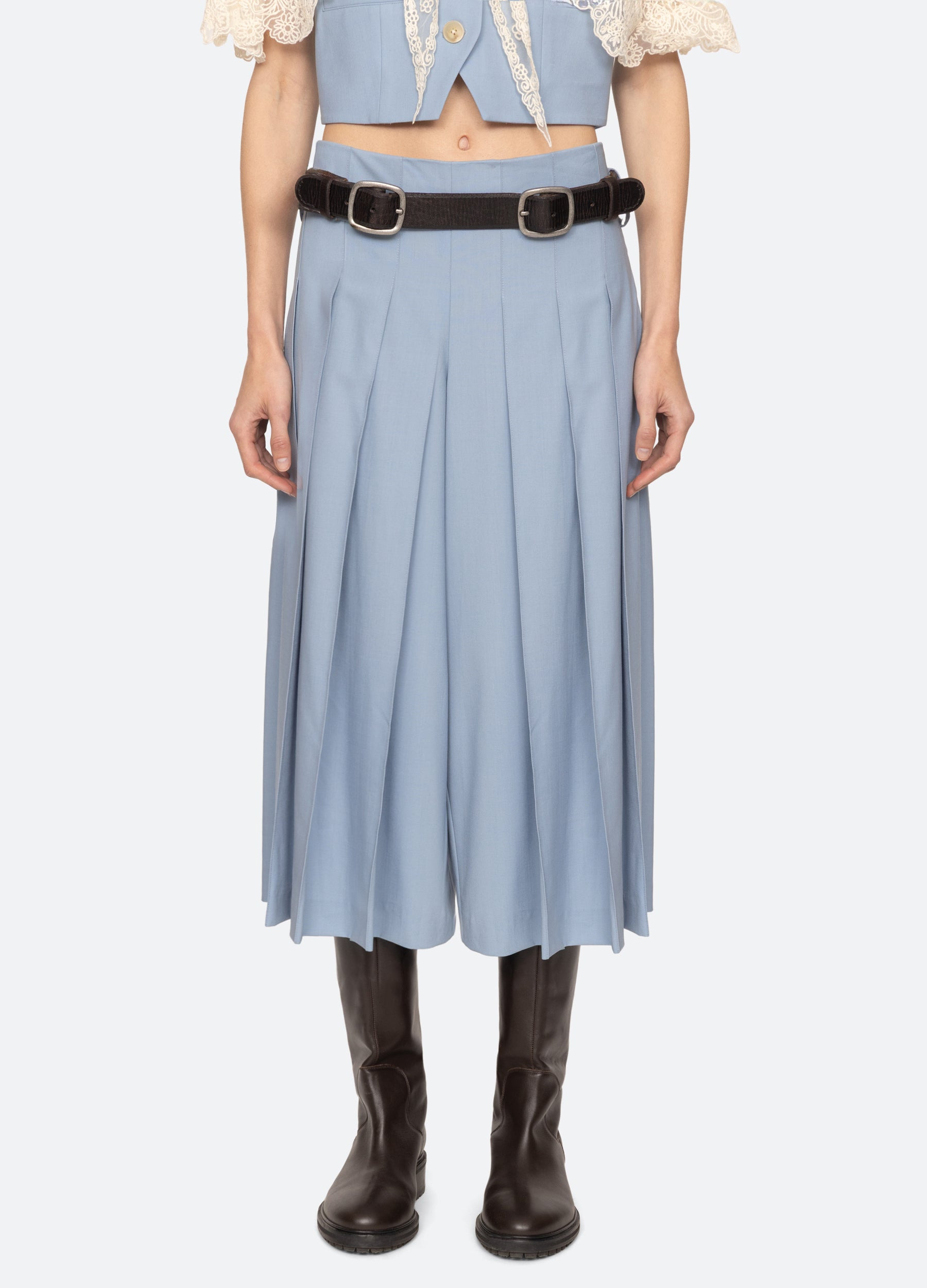 The Elisa culottes are crafted from lightweight tropical wool in a cropped silhouette. Pleats at the front and a removable belt provide structure, while the fluid fabric drapes beautifully with every step. DETAILS - 44% wool, 51% polyester, 5% spandex - invisible side zipper - designed for a slimmer fit - style #RS26-093 - model is 5'10'' and wearing a size 4