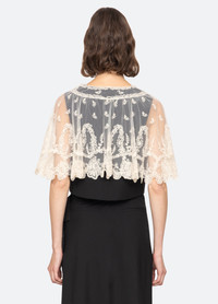 The Elisa capelet vest is tailored from lightweight tropical wool in a cropped silhouette. A removable, delicate floral lace capelet drapes over the shoulders, lending a touch of romantic refinement. DETAILS - self-51% polyester, 44% wool, 5% spandex - lining-55% viscose, 45% polyester - cape-100% polyester - button front - designed for a relaxed fit - style #RS26-090 - model is 5'10'' and wearing a size S