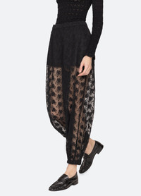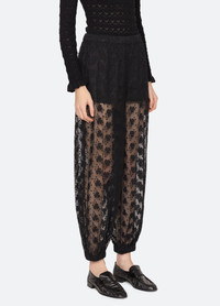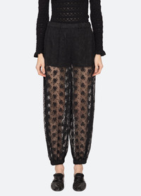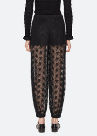 The Finn embroidered mesh pants showcase delicate floral embroidery with sheer accents, offering a light, airy feel. The cuffed hem adds a polished, refined finish, blending effortless elegance with modern femininity. DETAILS - self-100% nylon - lining-100% cotton - slip on - designed for a relaxed fit - style #AW25-037 - model is 5'10'' and wearing a size S