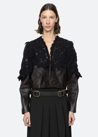 The Gwen leather jacket is crafted from smooth leather in a cropped silhouette. Delicate hand-crocheted detailing across the upper body lends a refined, artisanal finish. DETAILS - self-100% lamb leather - lace-70% cotton, 30% polyester - lining-100% acetate - front hook closure - designed for a relaxed fit - style #RS26-088 - model is 5'10'' and wearing a size S