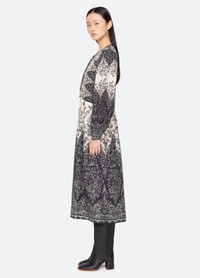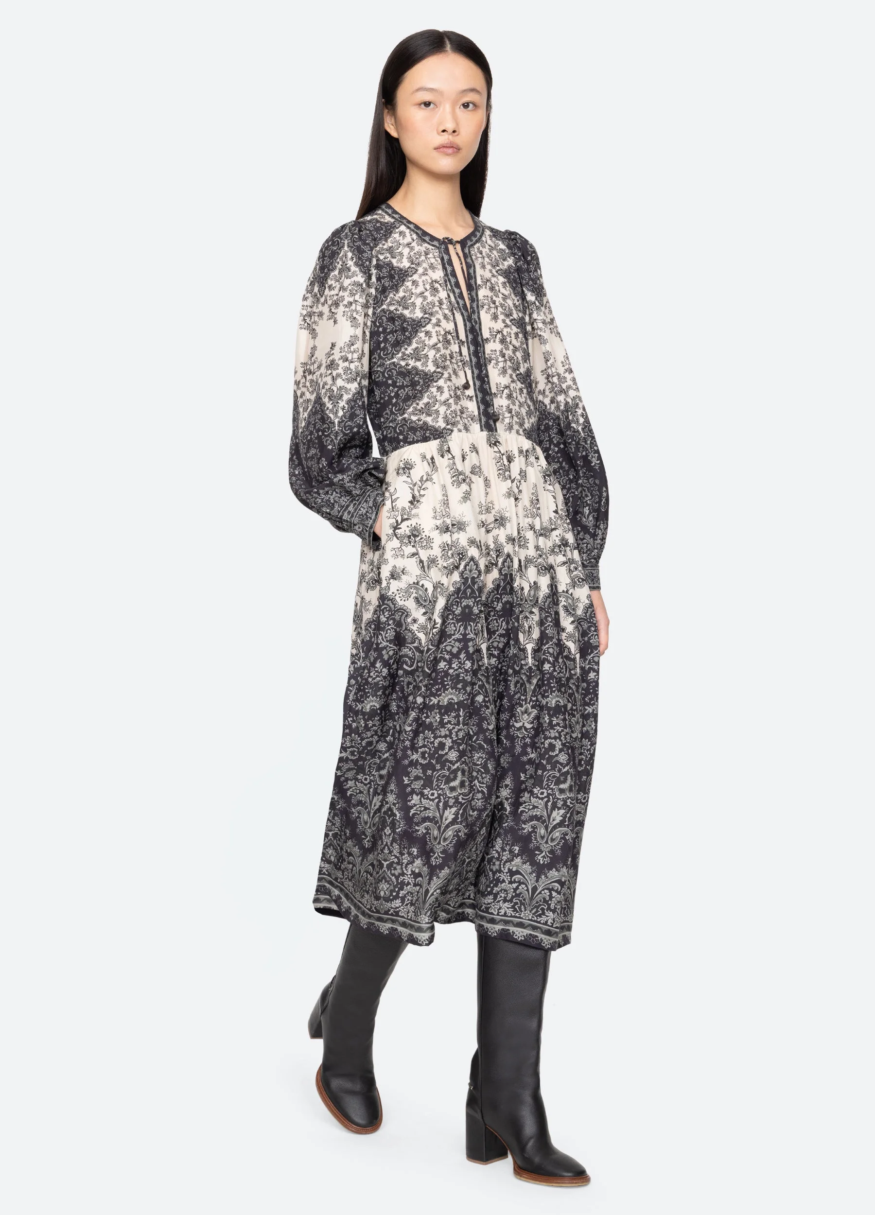 The Hedra floral print dress features a detailed floral motif and a flowing midi silhouette. Designed with long puff sleeves and a subtle v-neckline finished with tassel ties, it captures an effortless blend of feminine charm and modern ease. DETAILS - 100% viscose - invisible side zipper - designed for a relaxed fit - style #SS26-031 - model is 5'10'' and wearing a size S