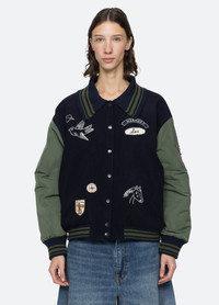 The Hester bomber jacket channels varsity heritage with a refined twist, showcasing custom Sea patches and intricate embroidery throughout. Finished with ribbed-knit trims, it blends a sporty silhouette with elevated craftsmanship. Designed for an oversized, relaxed fit. DETAILS - 100% extrafine merino wool - snap front closure - style #RS26-037 - model is 5'10'' and wearing a size S