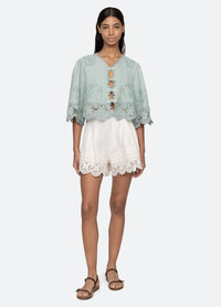 The Iyla soutache shorts feature pleated detailing, high rise waist and detailed soutache embroidery throughout. DETAILS - self-85% cotton, 15% linen - lining-100% cotton - embroidery-100% polyester - zipper and front hook closure - designed for a slimmer fit - style #PF25-061 - model is 5'10'' and wearing a size 4