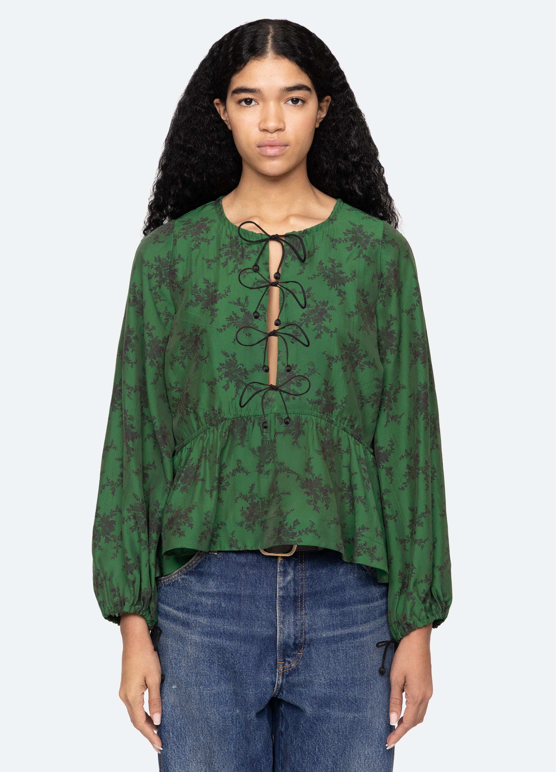 The Joan floral print top features long voluminous puff sleeves and delicate front tie closures that add a romantic touch. Finished with a flattering peplum hem, this top pairs timeless charm with an effortlessly elegant silhouette. DETAILS - self-80% viscose, 20% nylon - lining-100% cotton - tie front closure - designed for a relaxed fit - style #AW25-041 - model is 5'10'' and wearing a size S