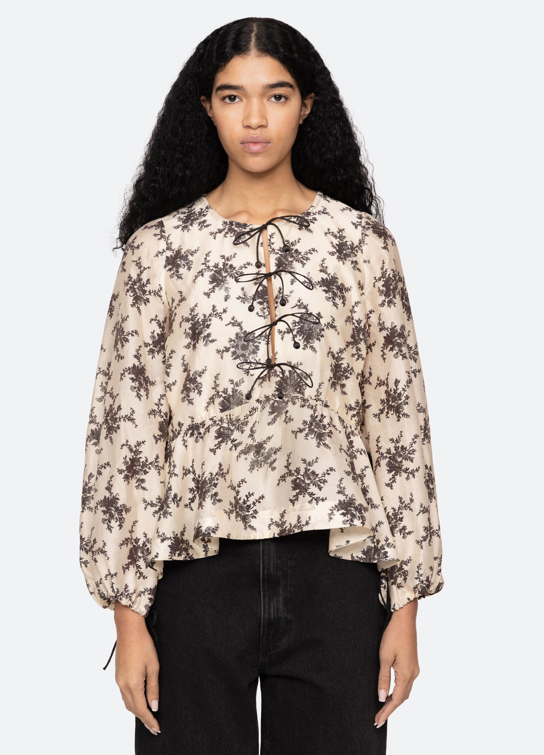 The Joan floral print top features long voluminous puff sleeves and delicate front tie closures that add a romantic touch. Finished with a flattering peplum hem, this top pairs timeless charm with an effortlessly elegant silhouette. DETAILS - self-80% viscose, 20% nylon - lining-100% cotton - tie front closure - designed for a relaxed fit - style #AW25-041 - model is 5'10'' and wearing a size S