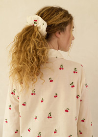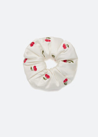 An online and in store exclusive. The Jude scrunchie features cross stitch embroidered cherry accents throughout. DETAILS - 100% silk - style #MC25-010