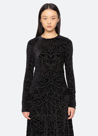 The Julie long sleeve top is crafted from floral patterned burnout velvet, offering a rich play of texture and transparency. Designed to pair effortlessly with the coordinating Julie midi skirt for a striking, head-to-toe look. DETAILS - self-68% polyester, 42% nylon, 8% elastane - binding-100% polyester - button back closure - designed for a slimmer fit - style #RS26-025 - model is 5'10'' and wearing a size S