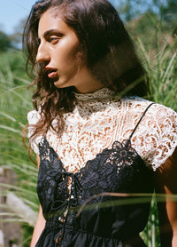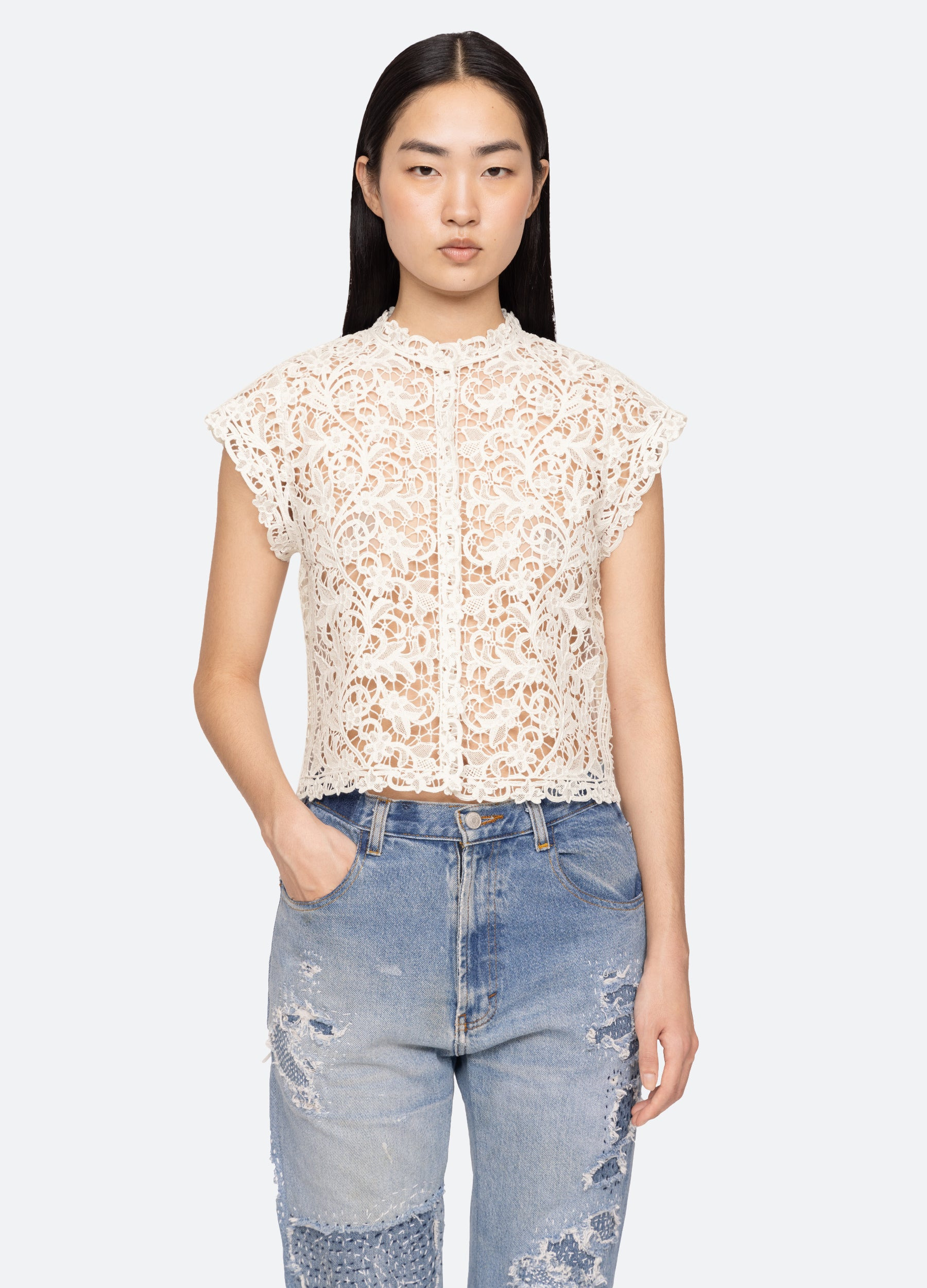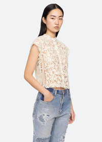 An online and in store exclusive. The Kira lace top features a high neck and cap sleeves. The perfect layering piece. DETAILS - 100% polyester - button down - style #SS25-418WEB - model is 5'10'' and wearing a size S
