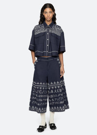 The Kit embroidery short sleeve top draws inspiration from vintage embroidery with sampler-style motifs, crafted with intricate embroidery throughout. Featuring a cropped silhouette and oversized front pockets, it blends nostalgic charm with modern, relaxed tailoring. DETAILS - self-100% cotton - embroidery-100% polyester - button front - designed for an oversized, relaxed fit - style #RS26-074 - model is 5'10'' and wearing a size S