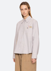 The Lavinia shirt features custom 'Sea' labels throughout, alongside intricate lace applique motifs and detailed embroidery. The design is further elevated by the refined striped shirting fabric, adding a touch of timeless sophistication. DETAILS - 100% cotton - button front - designed for a relaxed fit - style #AW25-052 - model is 5'10'' and wearing a size S