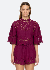 The Lula embroidered top features embroidered eyelet detailing throughout, short flowy sleeves, high neck and cropped silhouette. DETAILS - 45% viscose, 45% linen - button back fastening - designed for a relaxed fit - style #PF25-016 - model is 5'10'' and wearing a size S