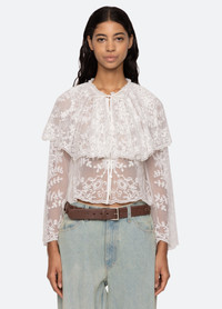 The Marja embroidered blouse features a delicate capelet, front tie closure, long flowing sleeves and floral embroidered mesh. DETAILS - self-100% polyamide - embroidery-100% polyester - button front - front tie - designed for a relaxed fit - style #SS25-119 - model is 5'10'' and wearing a size S