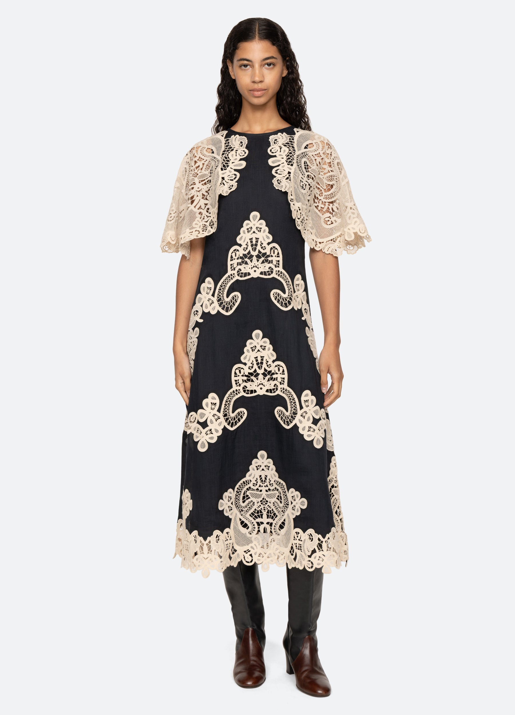 The Medina lace dress is crafted with intricate lace applique, delicately detailed to enhance its refined charm. The cape-style sleeves and flattering midi silhouette make it an elegant choice for any occasion. DETAILS - self-100% ramie - lining-100% cotton - embroidery-100% polyester - invisible back zipper - designed for a slimmer fit - style #AW25-101 - model is 5'10'' and wearing a size 4