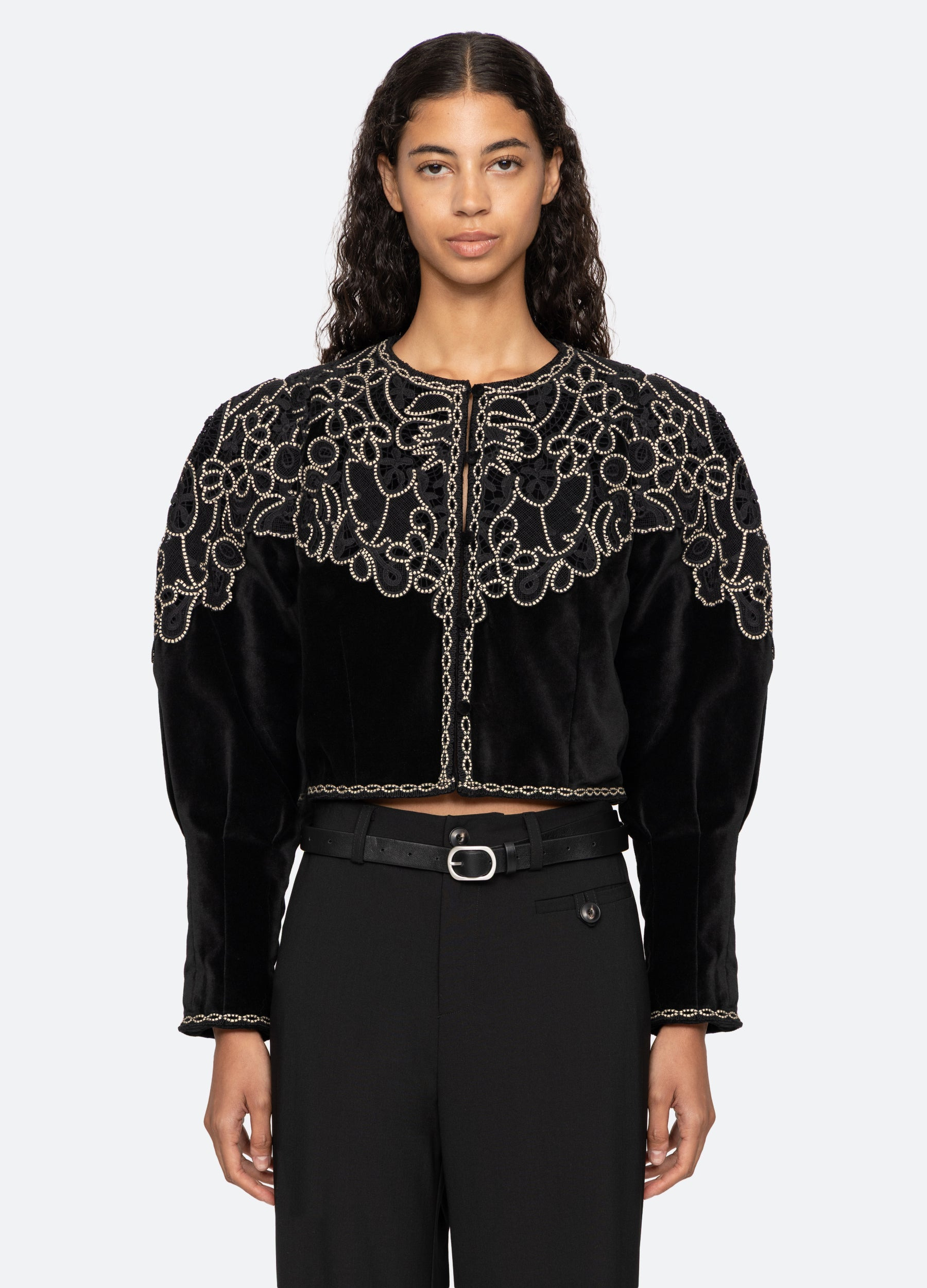 The Medina lace jacket is cut from plush velvet and defined by its sculptural, cropped silhouette. Voluminous sleeves and padded shoulders create dramatic structure, while tonal lace applique is accented by contrasting embroidery. A striking blend of elegance and edge, this piece makes a bold yet timeless statement. DETAILS - self-100% cotton - lining-100% polyester - embroidery-100% polyester - button front - designed for a relaxed fit - style #AW25-098 - model is 5'10'' and wearing a size S