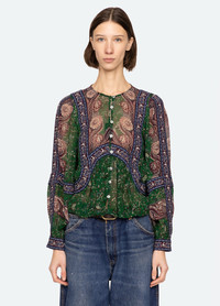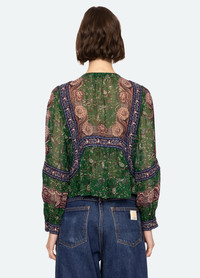 The Melba floral print top blends vintage-inspired florals with an eye-catching boarder print, finished with voluminous puff sleeves and a refined button-down front. DETAILS - self-100% viscose - embroidery-100% polyester - button front - designed for a relaxed fit - style #AW25-054 - model is 5'10'' and wearing a size S