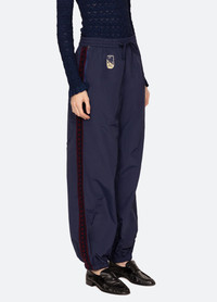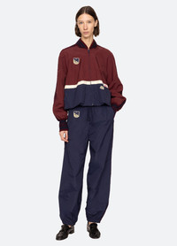 The Mira windbreaker pants blend ease and detail with an elasticized waistband, intricate crochet trim along the sides, and a custom 'Sea' patch. Designed to pair seamlessly with the matching Mira windbreaker jacket for a coordinated statement look. DETAILS - self-100% nylon - lining-100% cotton - decoration-50% wool, 50% acrylic - slip on - elasticized drawstring waist with ties - designed for a relaxed fit - style #AW25-058 - model is 5'10'' and wearing a size S