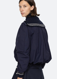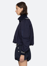 The Mirian windbreaker jacket features a cropped silhouette with ribbed knit collar and cuffs. DETAILS - self-100% nylon - lining-100% cotton - filling-100% polyester - combo-100% wool - zipper front - designed for a relaxed fit - style #PF25-078 - model is 5'10'' and wearing a size S